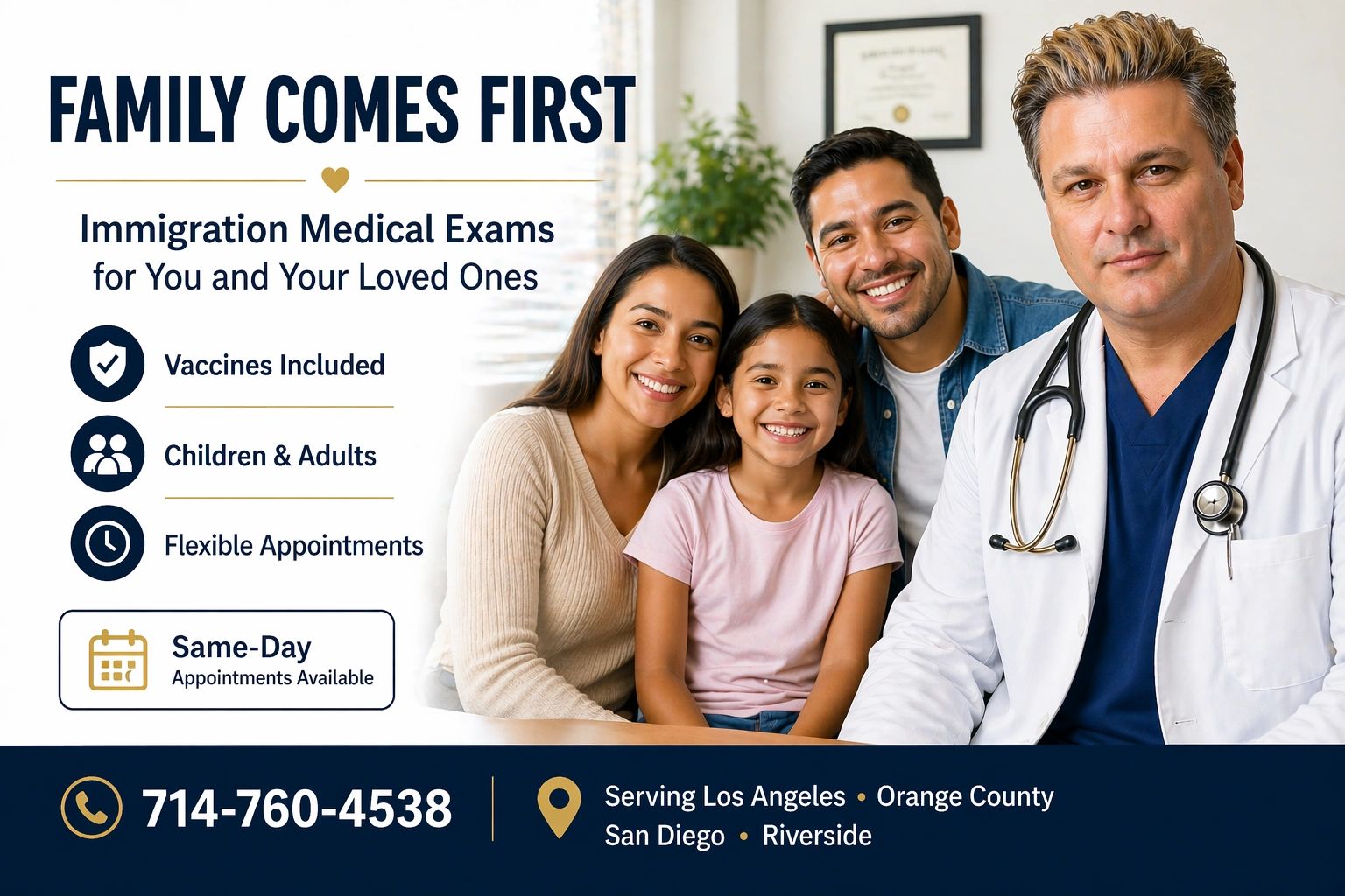ImmigrationMedicalExams.com provides fast, all-inclusiveUSCIS immigration medical exams with on-site labs and vaccinations for Green Card and adjustment-of-status applicants. Our certified USCIS Civil Surgeons focus exclusively on immigration medicals — no sick visits, no long waits, and no hidden fees. Everything required for your Form I-693 is completed in two convenient visits, including physical examination, blood tests, tuberculosis screening, and a 3-Day I-693 Turnaround • 💵 All-Inclusive Pricing • 💉 Vaccines + Labs Included ll necessary vaccinations. With same-day appointments, weekend availability, and a guaranteed 3-business-day turnaround for your sealed I-693 form, we make the immigration process faster and stress-free. Our clinics offer multilingual support and transparent flat-rate pricing that includes all tests and vaccines, so you know exactly what to expect. Whether you’re in Costa Mesa, Los Angeles, Orange County, Riverside, or San Diego, our experienced Civil Surgeons are ready to help you complete your USCIS medical exam accurately, affordably, and on time. Book your appointment today and take the next step toward your Green Card with confidence.